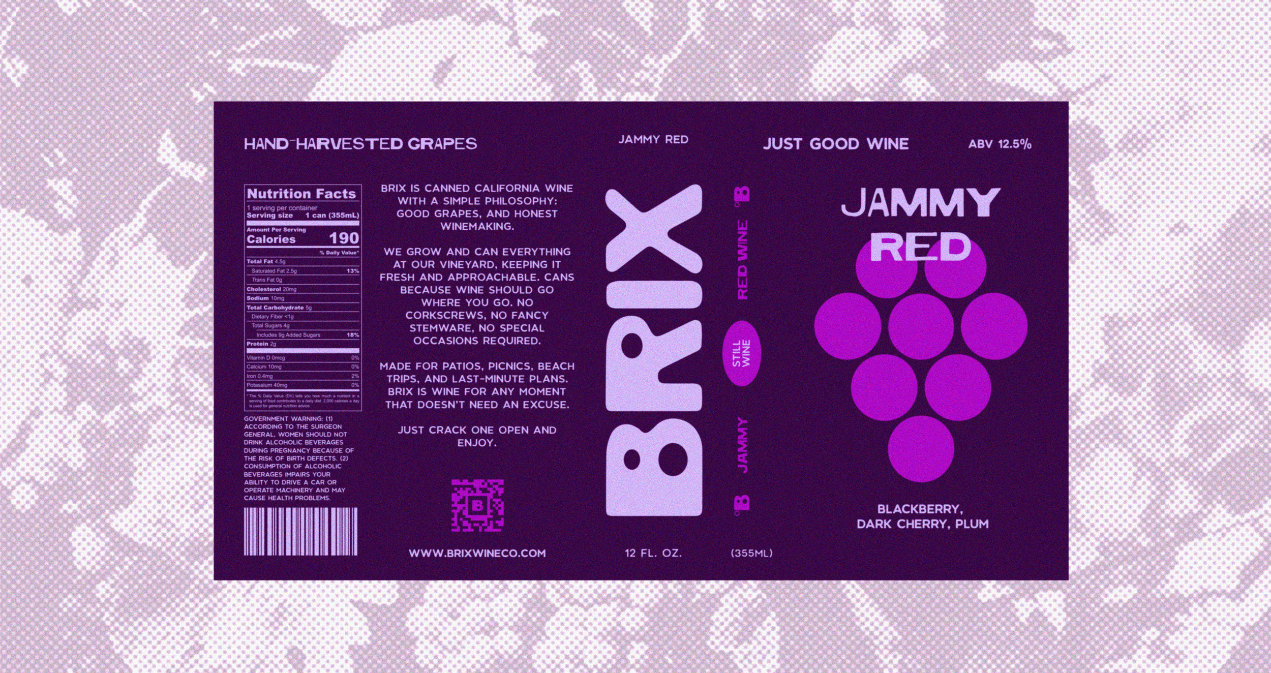 BRIX is a modern canned wine brand built around the idea of “the building blocks of a good time.” The name references both the sugar content in grapes and the modular design system; bold geometric shapes, stacked layouts, and color coded varieties that act as visual building blocks. The brand strips wine down to its essentials: color, flavor, and connection. Vibrant colors, easy language, and flexible layouts create a system that feels approachable and modern.